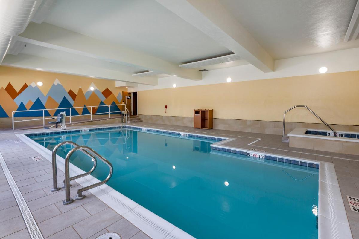 The gallery highlights guest rooms with clean lines and practical layouts, a breakfast area serving daily hot options, and an indoor pool with spa tub. Fitness and business facilities reflect the property’s balance of leisure and convenience.